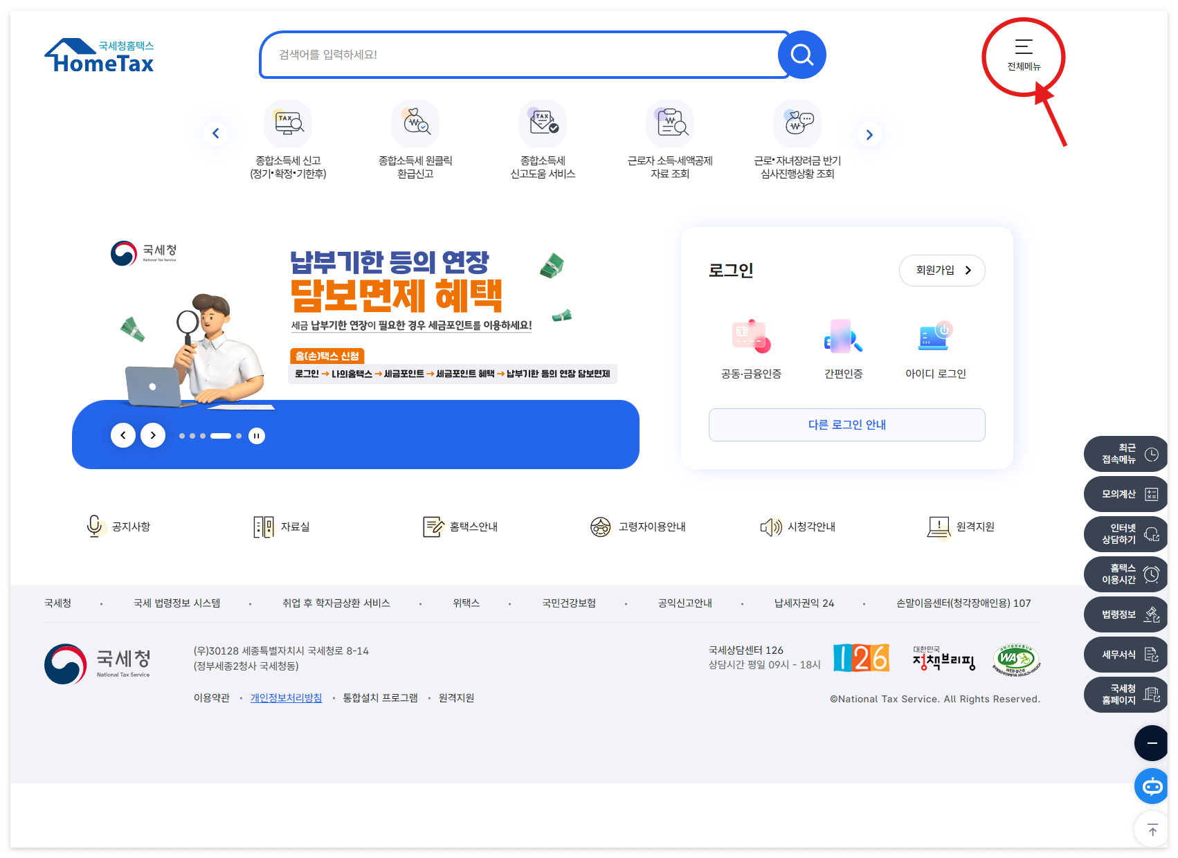 국세청 홈택스 메인화면에서 오른쪽 상단