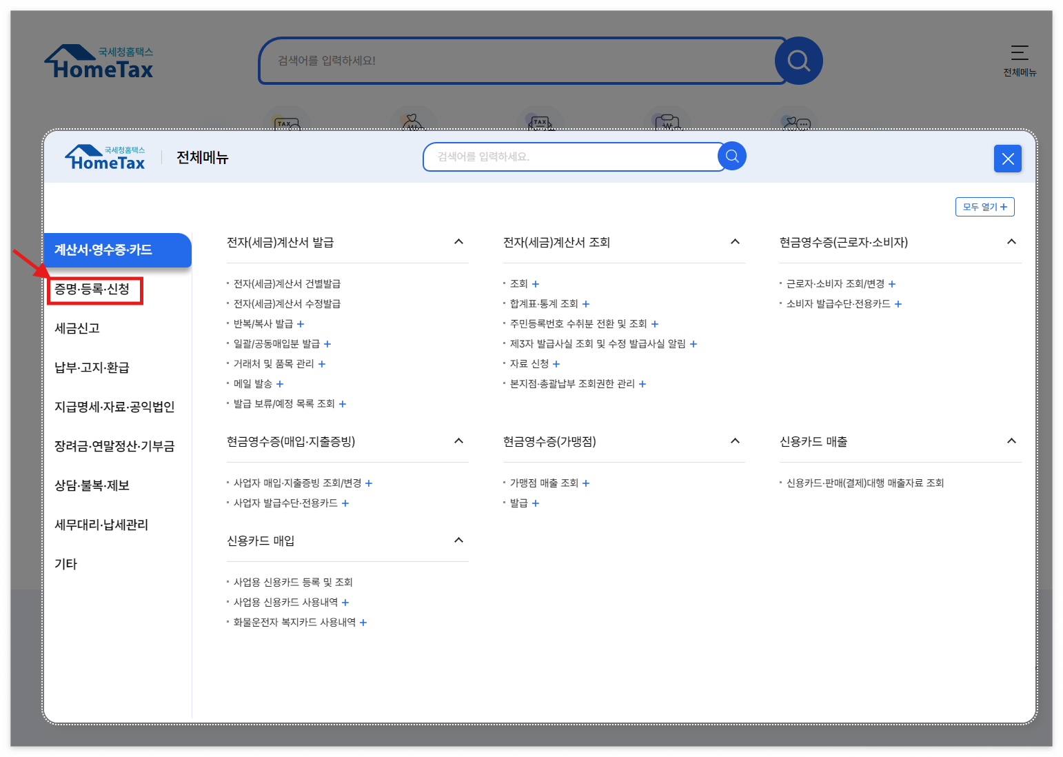 2) '전체메뉴' 클릭 -> '증명*등록*신청' 클릭
