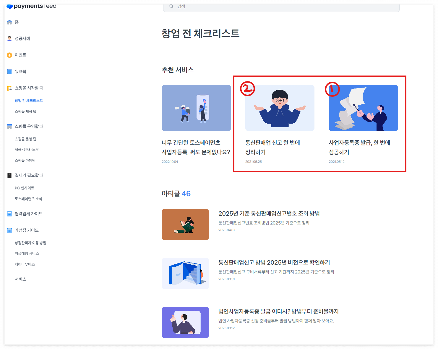 2) 토스페이먼츠 홈페이지 '창업전 체크리스트' 클릭