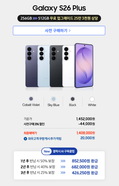 같은 제품을 사더라도 사전예약 기간에 사면 저장용량 업그레이드나 할인 쿠폰처럼 체감 혜택이 커질 수 있기 때문입니다. 다만 갤럭시 S26 사전예약 혜택은 구매처, 자급제 여부, 카드사, 통신사 조건에 따라 달라질 수 있으니 결제 전에 꼭 세부 조건을 확인하는 것이 좋습니다.