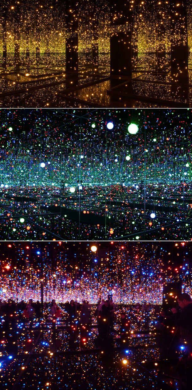쿠사마의 대표작 중 하나는 「무한 거울방(Infinity Mirror Room)」 시리즈입니다. 이 작품은 거울로 이루어진 방 안에 수많은 LED 조명이나 구형 오브제를 배치하여, 관람객이 무한히 확장되는 공간 속에 들어간 듯한 경험을 하게 만듭니다. 관객은 마치 우주 한가운데 있는 듯한 환상을 느끼며, 예술과 공간, 자아의 경계가 모호해지는 체험을 하게 됩니다. 이 작업은 현대미술 전시 중 가장 인기 있는 설치작 중 하나로, 관람을 위해 몇 시간씩 줄을 서는 진풍경을 만들어내기도 합니다.