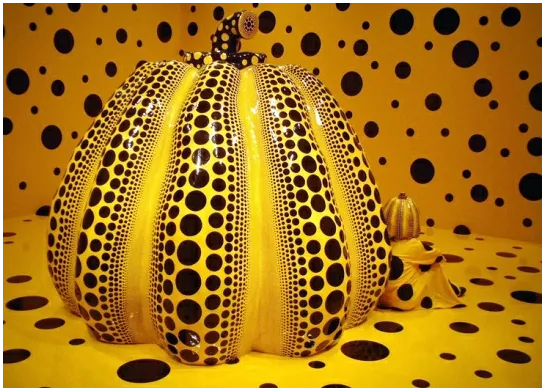 또한 그녀의 트레이드마크라고 할 수 있는 물방울 무늬(Dots)는 거의 모든 작품에 등장합니다. 물방울은 그녀가 반복적으로 경험한 환각의 이미지이자, 생명과 우주의 기호입니다. 「폴카닷 룸(Pumpkin Room)」, 「나의 영혼을 위한 만개의 배(Narcissus Garden)」, 호박 조각 시리즈(Pumpkin Sculptures) 등에서 볼 수 있는 이 패턴은 반복을 통해 치유와 통제를 추구하려는 작가의 심리적 표현이라 할 수 있습니다.