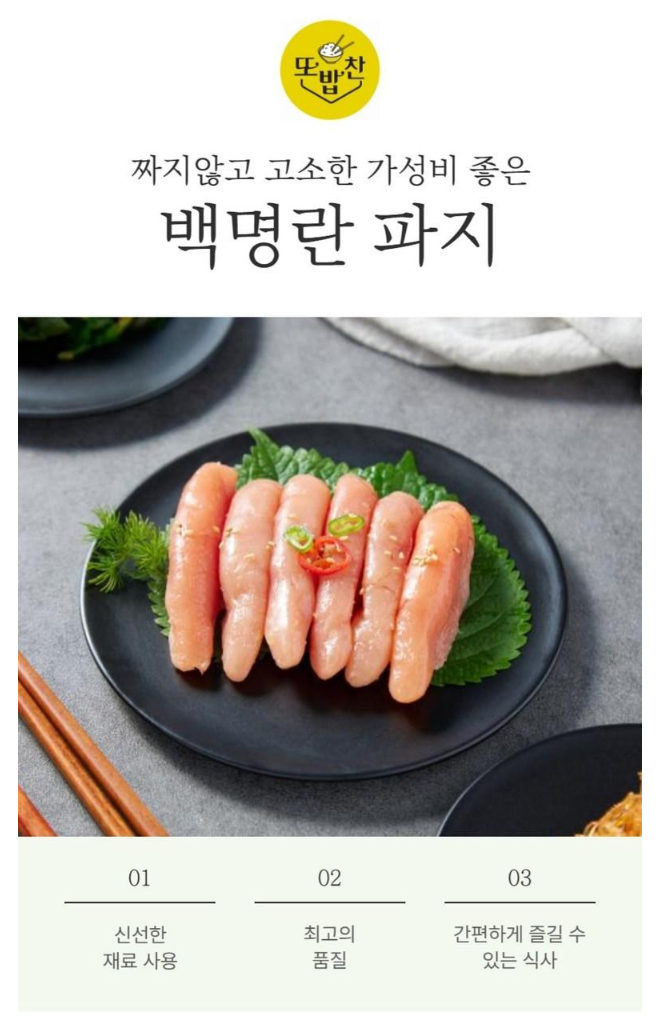 그중에서도 후기가 확실히 많은 제품이 또밥찬 국내제조 저염 백명란 파지젓 1kg 타입이에요.
