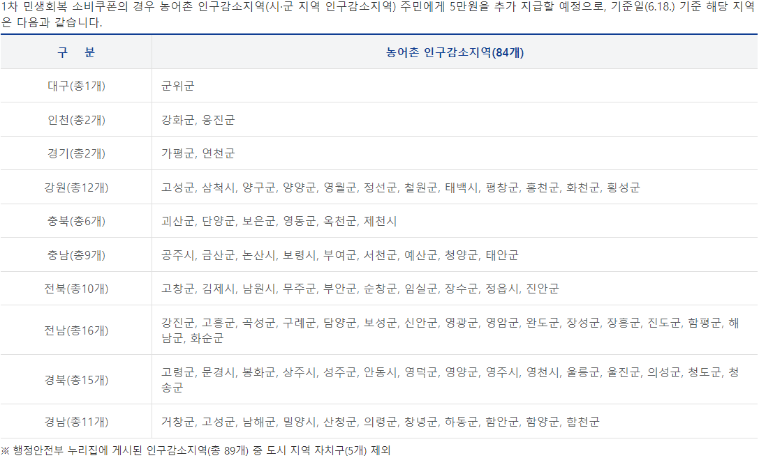 • 동시에, 민생회복 소비쿠폰이 지역 균형발전에도 기여할 수 있도록 비수도권(서울,경기,인천 제외) 주민은 3만원을, 농어촌 인구 감소지역(84개 시군) 주민은 5만원을 추가로 지급할 예정