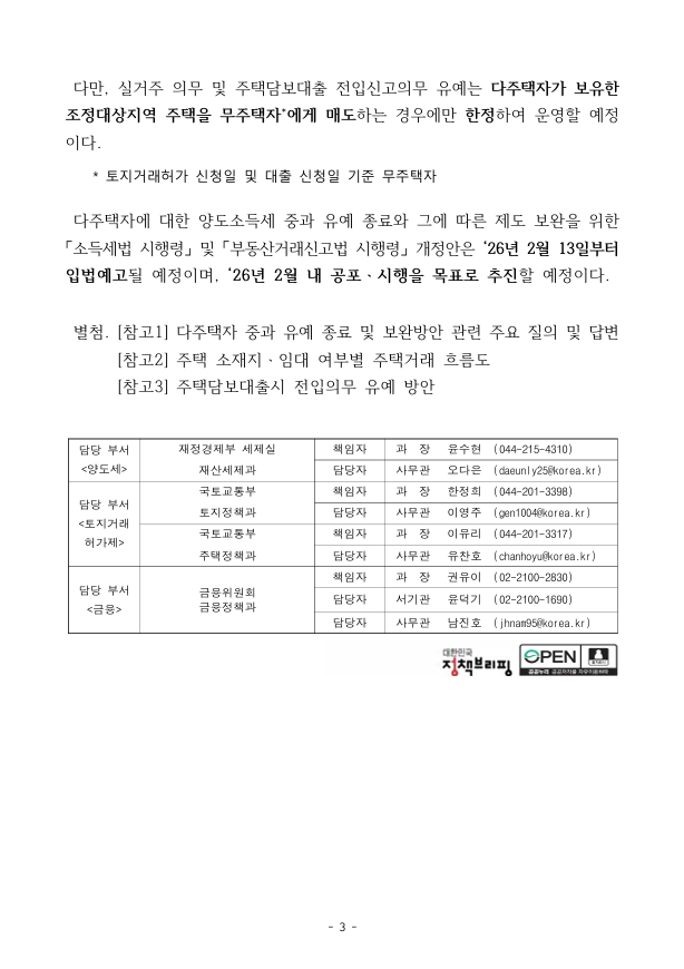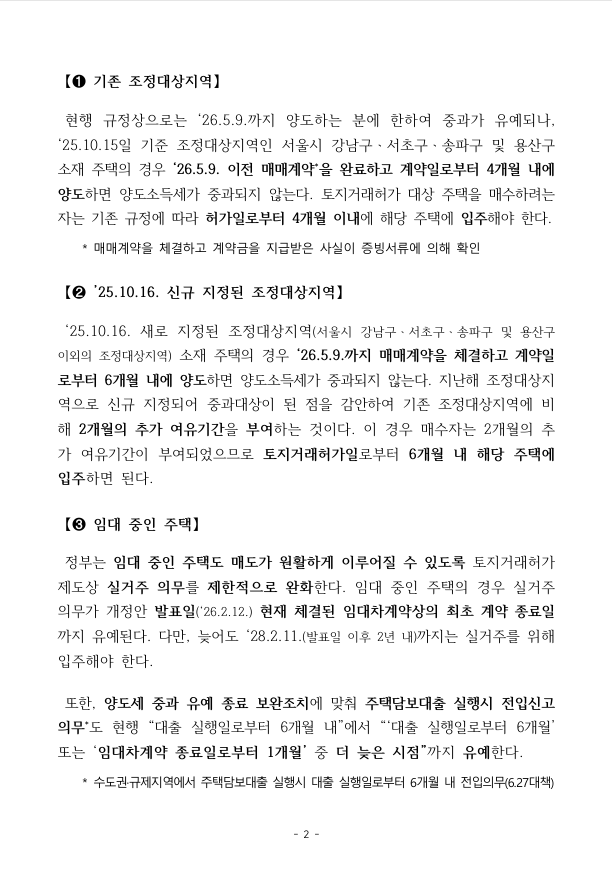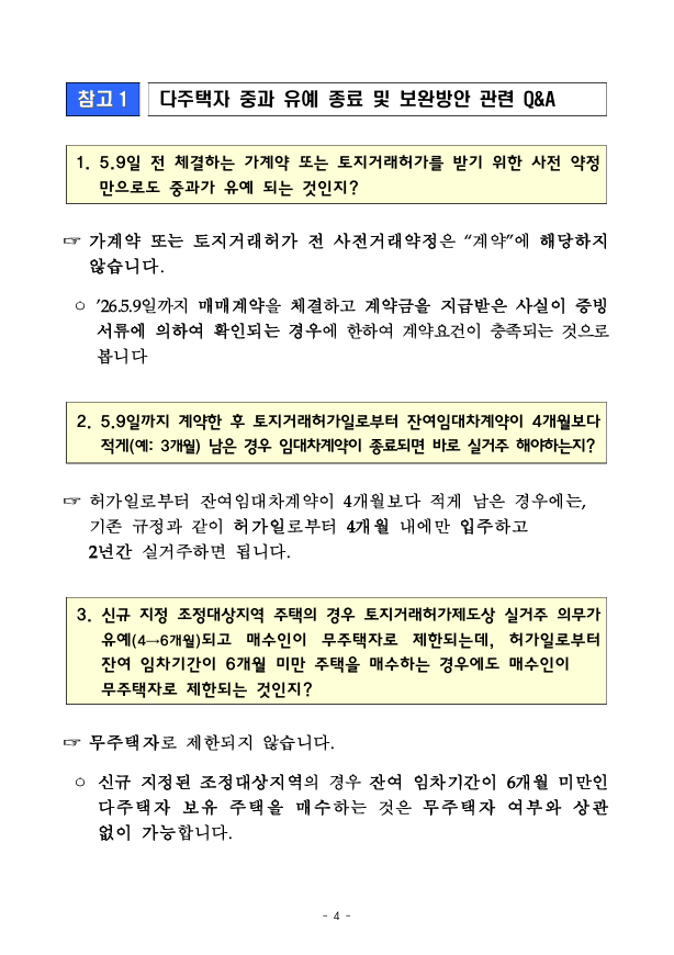 정부에서 다주택자에 대한 양도소득세 중과 유예 조치를 현재 예정된 일몰(종료) 기한인 2026년 5월 9일 예정대로 종료한다. 정책의 예측 가능성과 신뢰성 확보를 위해 당초 예정된 기한에 종료하되, 제도간 정합성을 제고하고 국민 불편을 최소화하기 위한 보안방안을 마련하였습니다.