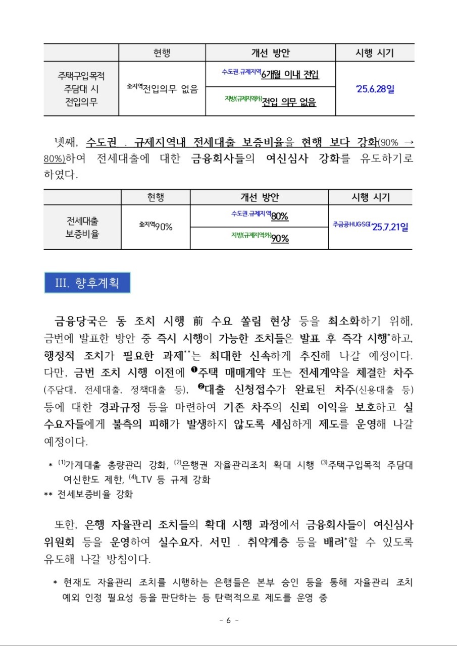 - 대출 급격 중단 없이 금융사 자율조정 유도