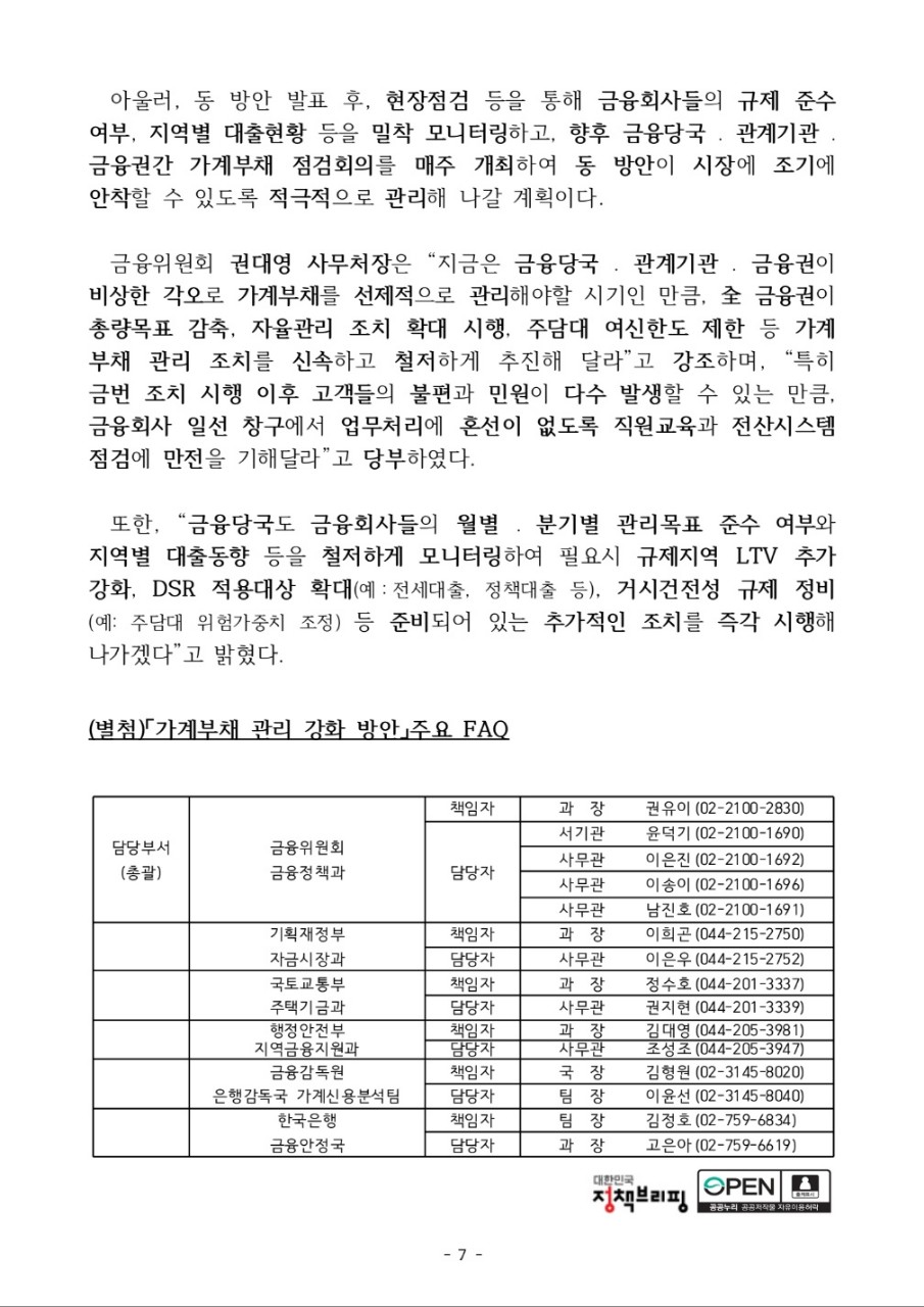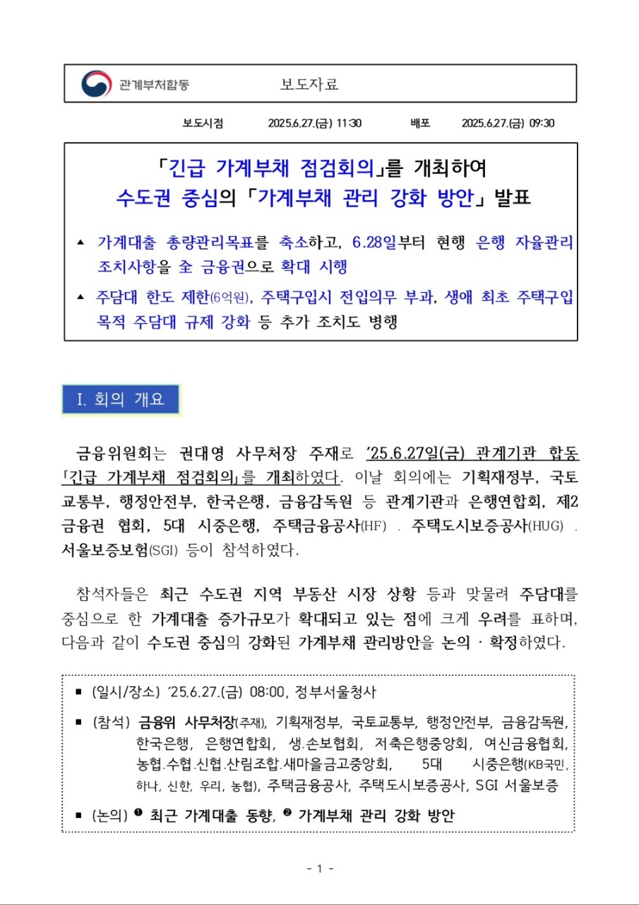 다음은 2025년 6월 27일 정부의 긴급 가계부채 점검회의에서 발표된