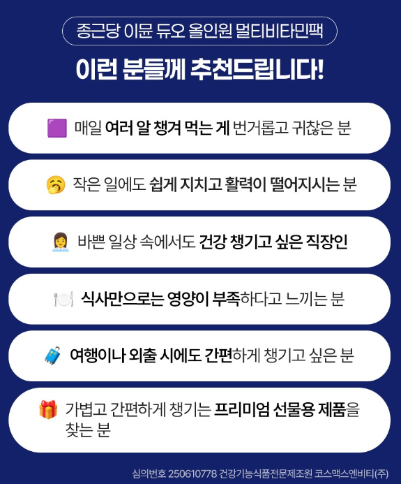 - 바쁜 직장인/학생: 영양제 여러 개 챙기기 귀찮은 분