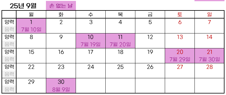 - 9월 1일(월), 10일(수), 11일(목), 30일(화) : 평일이라 이삿짐 센터 비용 저렴할 수 있음, 이사 후 관공서 및 기타 업무 처리 가능
