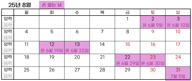 ※ 손 없는 날은 매년 양력 날짜로 달라지므로, 미리 확인이 필요합니다.